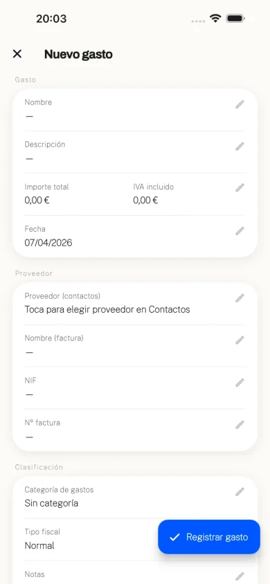 Fotografía un ticket o sube un PDF. La app extrae proveedor, fechas, importes, IVA, categoría, etc., sin que tengas que teclearlo todo.
