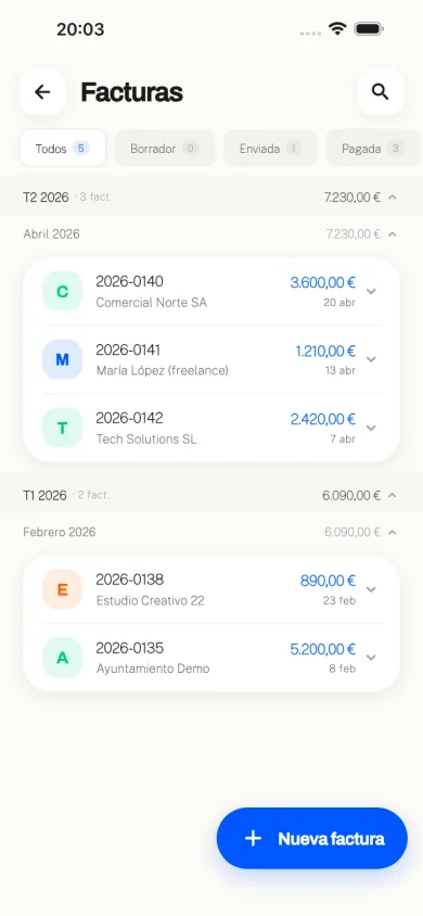 Crea y envía facturas con numeración automática, IVA e IRPF y plantillas con tu marca. Preparado para VeriFactu, con remisión a la AEAT, Facturae 3.2 a la administración pública vía FACe y firma electrónica.