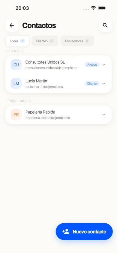 Gestiona clientes y proveedores con todos los datos fiscales necesarios. Zonas fiscales automáticas, direcciones con autocompletado y vinculación con facturas y gastos.