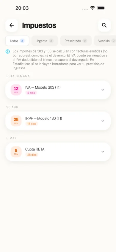 El sistema calcula automáticamente el IVA a ingresar (Modelo 303), los pagos fraccionados del IRPF (Modelo 130) y lo esencial de cara al Modelo 100, además de IGIC, IPSI y más. Con calendario fiscal y alertas.